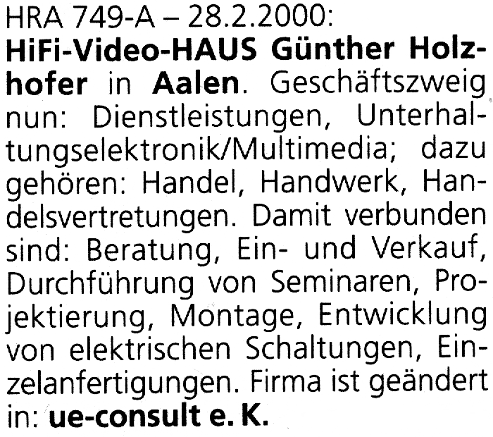 Gegründet am 01.10.1983 Geschäftstägigkeit reduziert ab 01.10.1997 ab 28.02.2000 Firma geändert in ue-consult e.K. (hier anklicken Handelsregisterauszug) |
